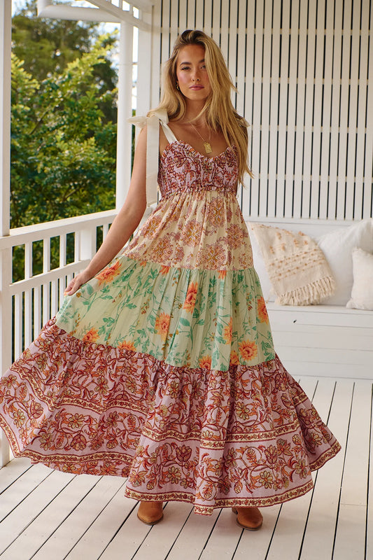 Green Ethnic Print Boho Tiered Mini Flowy Dress