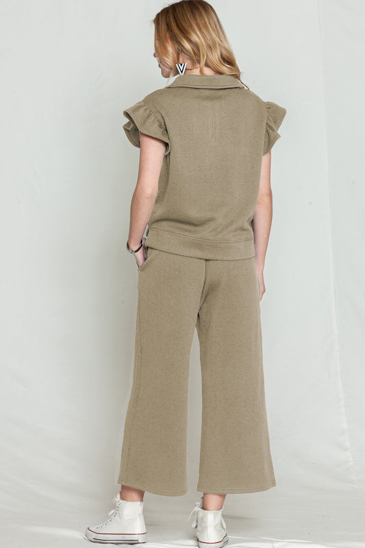Navy Blue Textured Ruffle Cap Sleeve Top And Wide Leg Pants Set