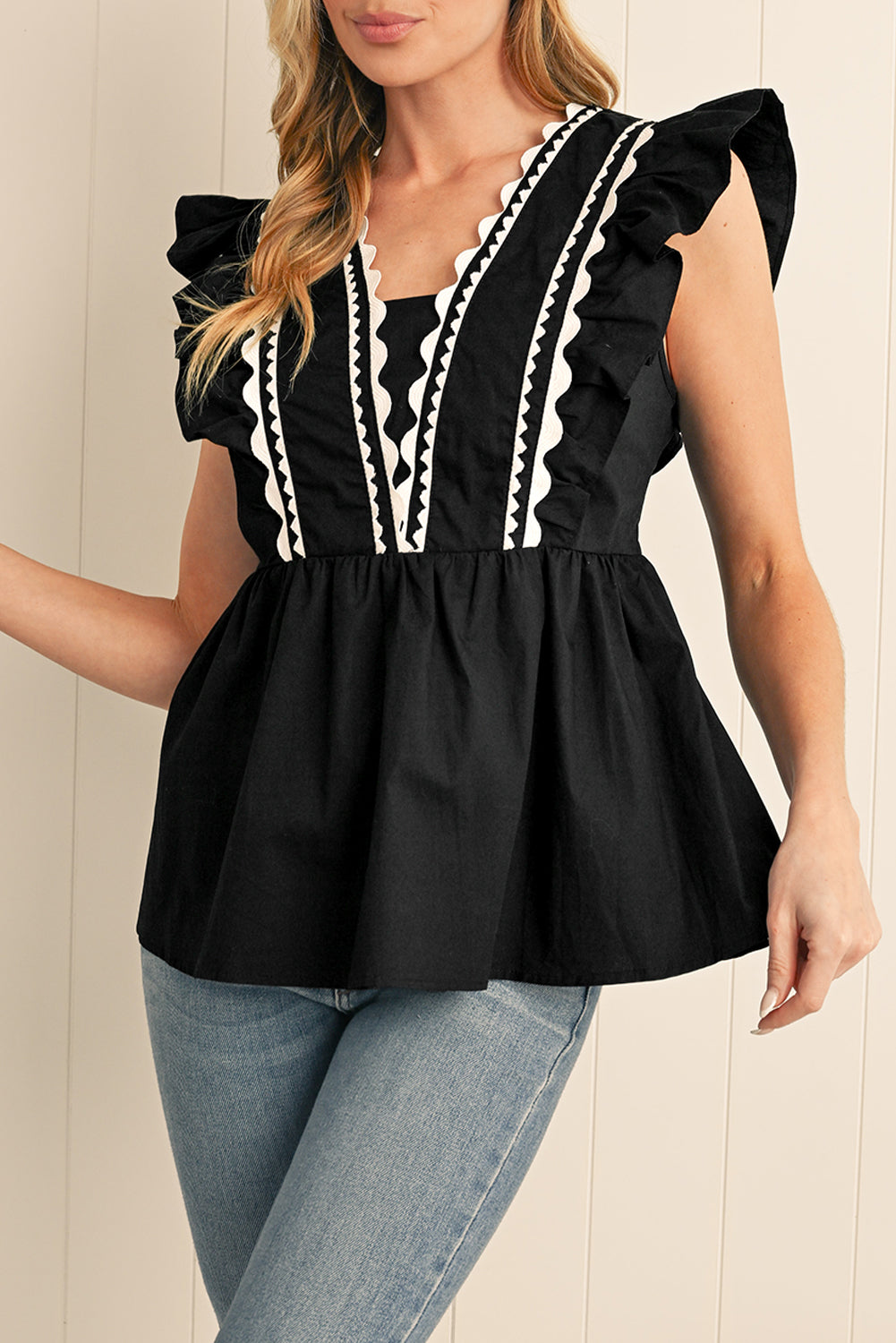 Black Ricrac V Neck Ruffle Sleeveless Blouse