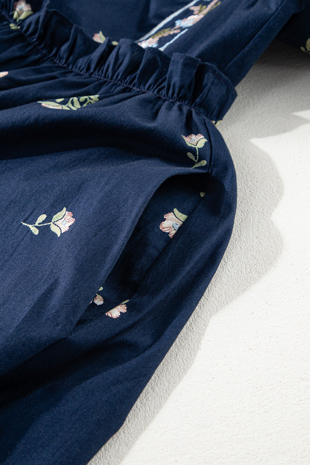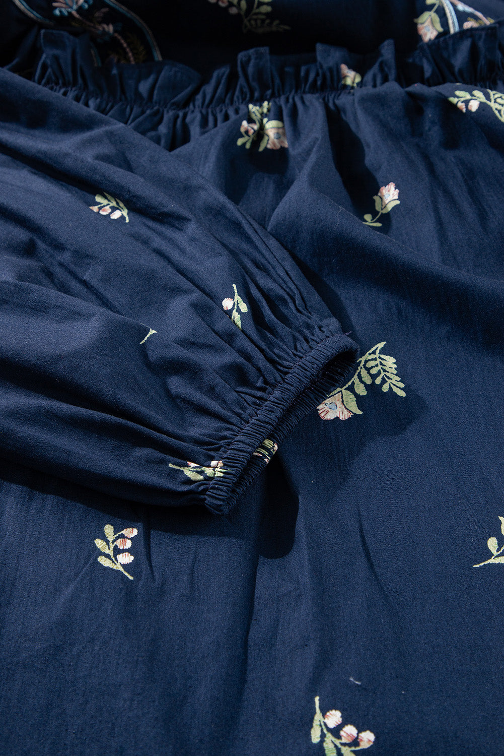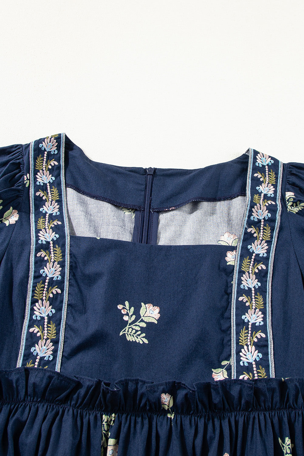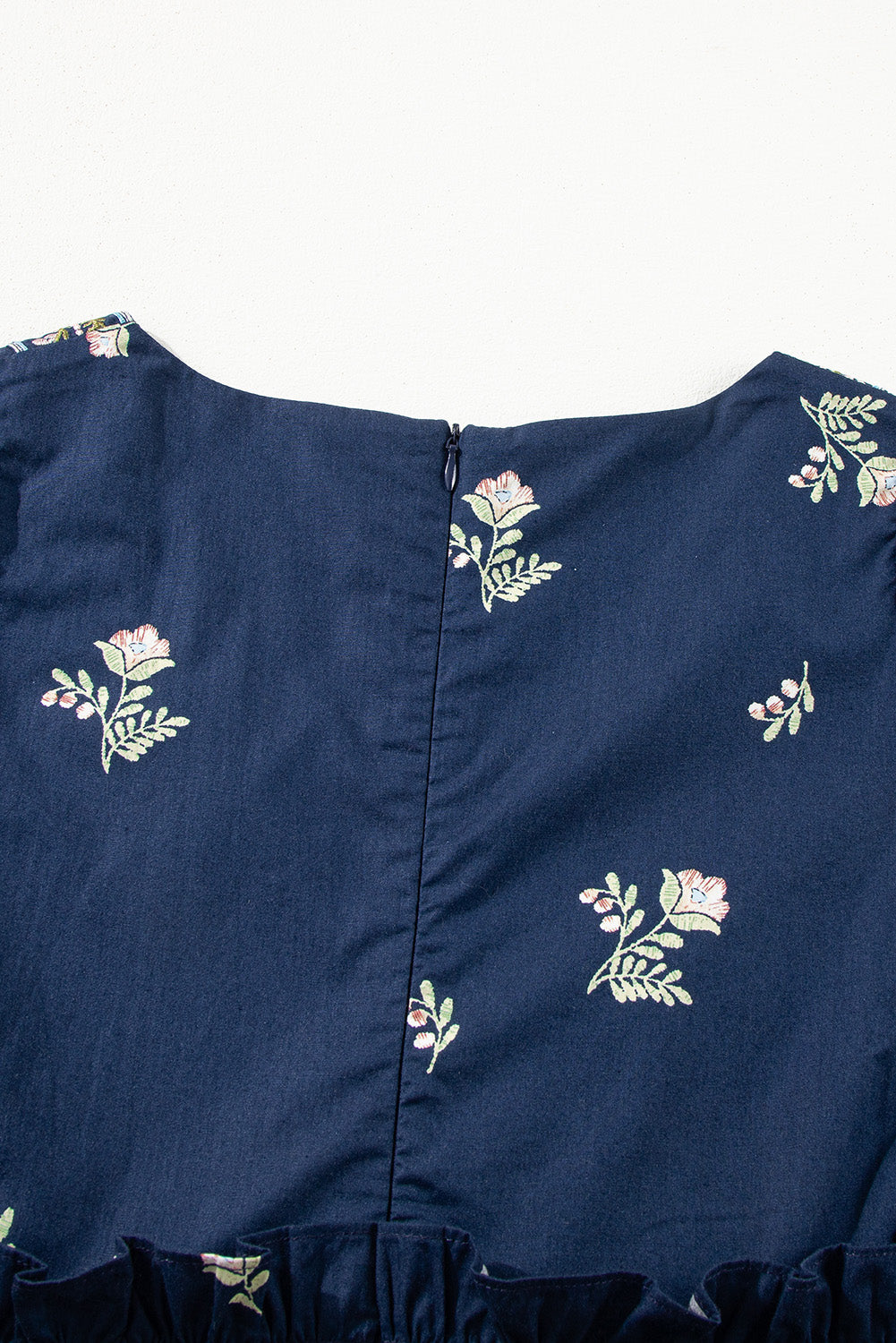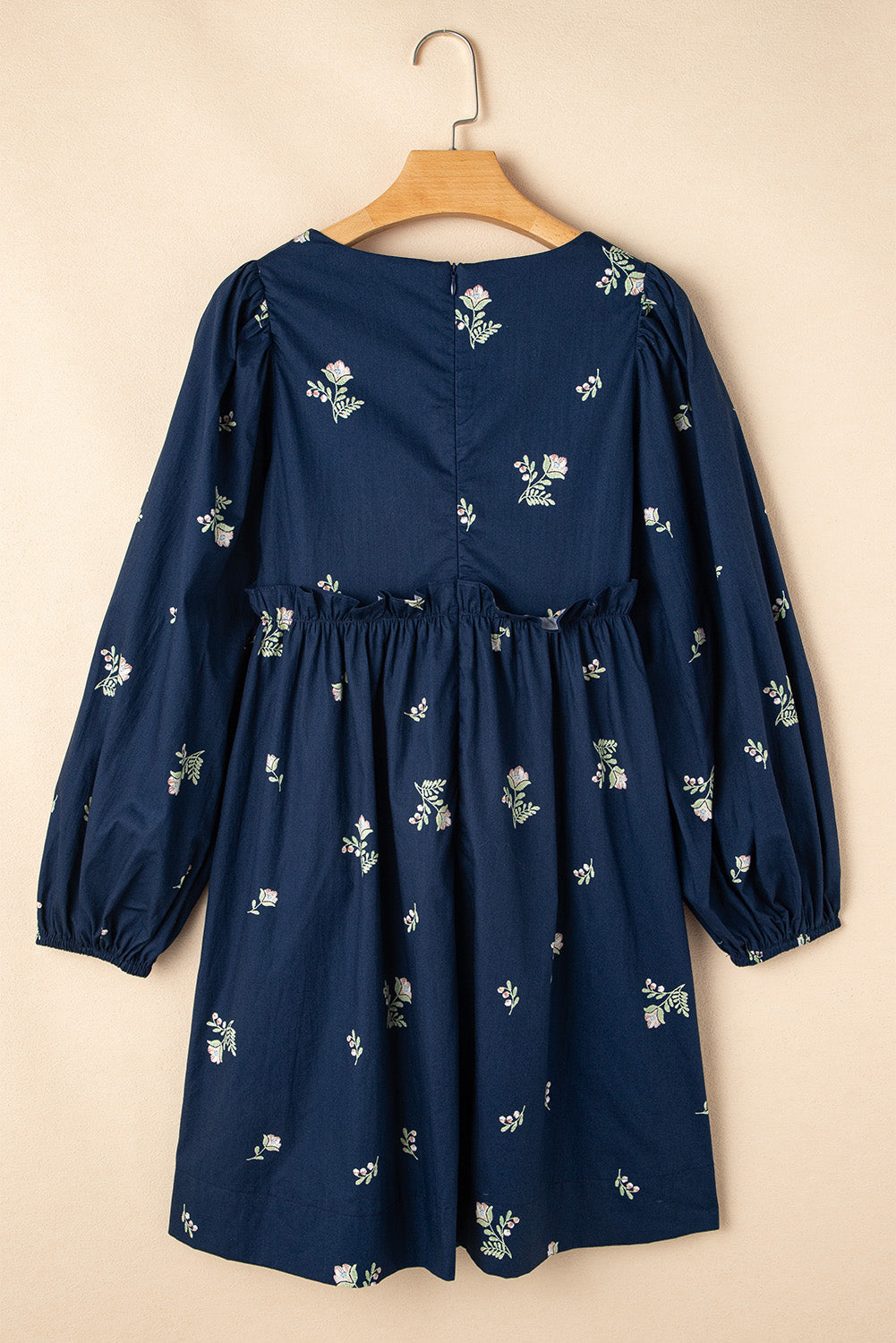 Blue Floral Embroidered Puff Sleeve Babydoll Dress