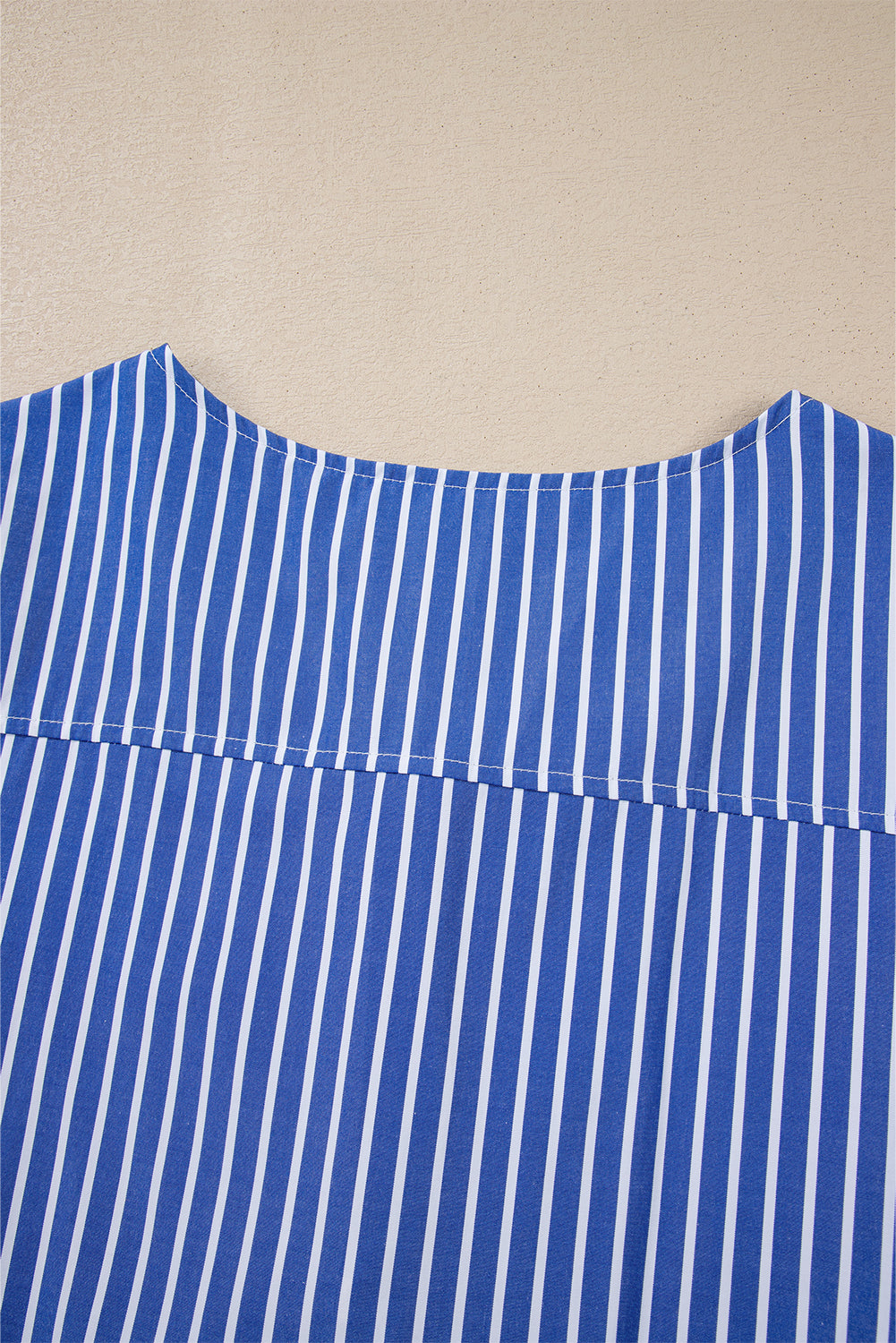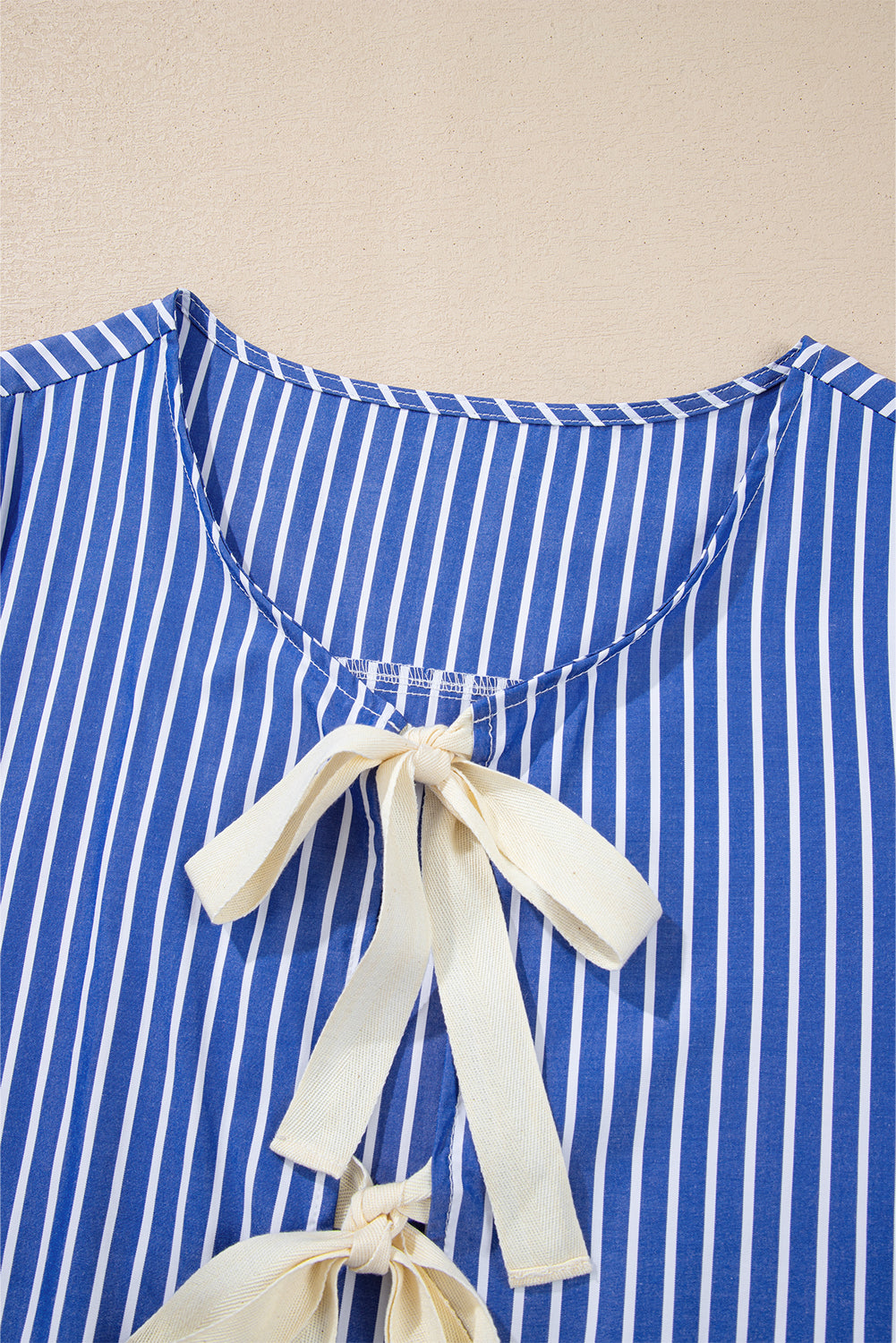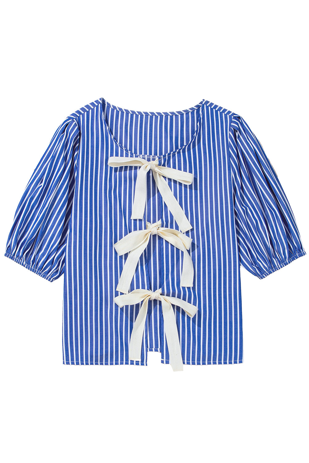 Blue Stripe Bow Tie Front Puff Short Sleeve Blouse