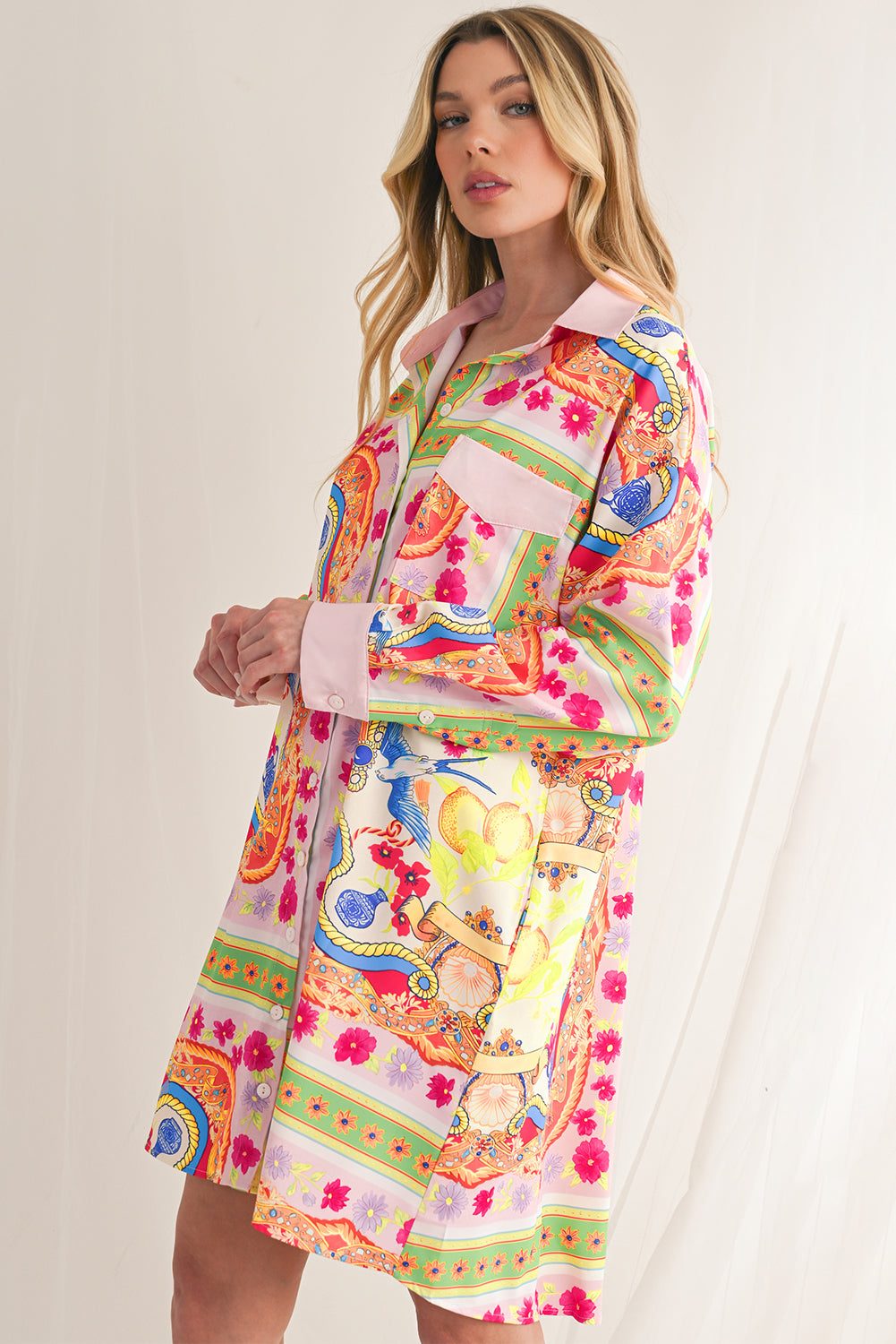 Multicolour Abstract Print Button Long Sleeve Shirt Dress