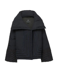 A wrap puffer teeming with motifs of Japanese design and practicality. The Quantum Jacket is our newest puffer silhouette. This vegan athleisure style features our electric blue thread detailing, press stud closures, and a geometric wrap shape. Our model wears a size Small. She is 180cm tall and dress size AU 8 (US 4).