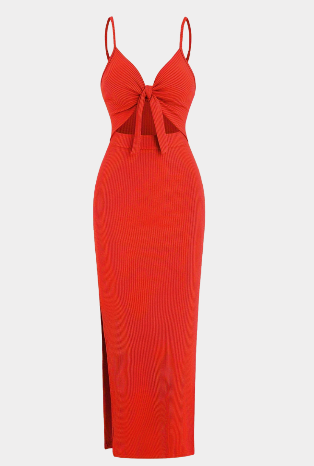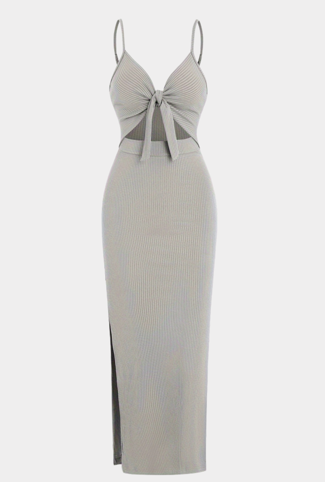 "This lace-up hollow slit sling dress is designed with a mid-length, one-piece cut that’s easy to wear. It features a front lace-up detail, side cutouts, and a slit for added comfort and movement. The Roxy dress has a mid-waist fit and a slip-on style with no zippers. Suitable for casual outings or evening plans, offering a clean and fitted look."
