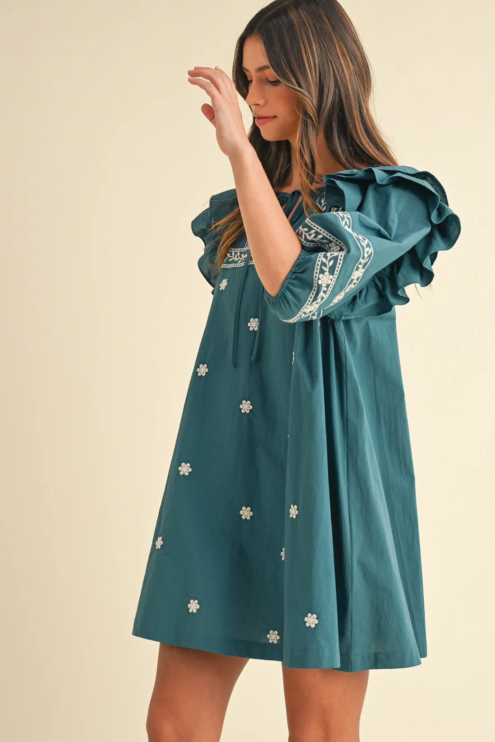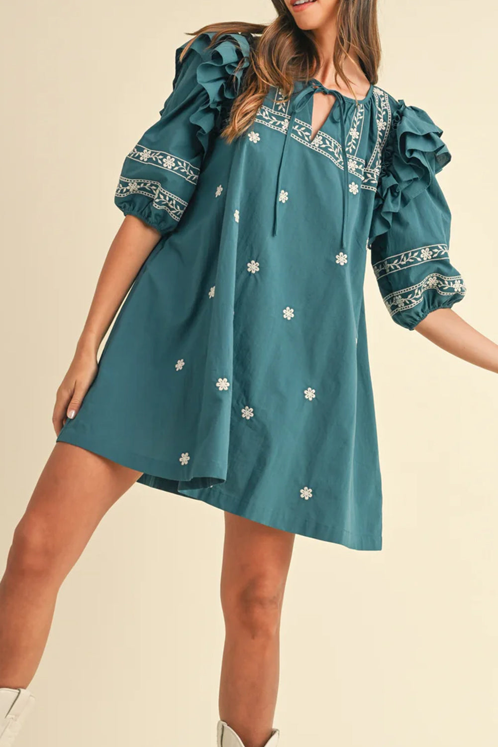 Skobeloff Boho Floral Puff Sleeve Tie Neck Mini Dress
