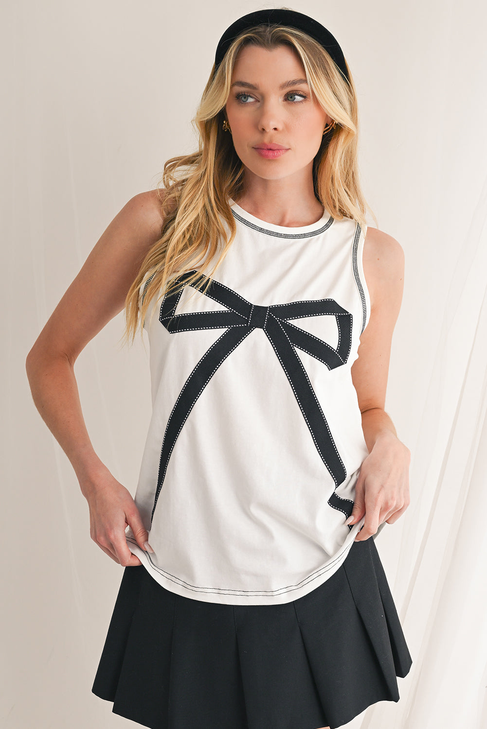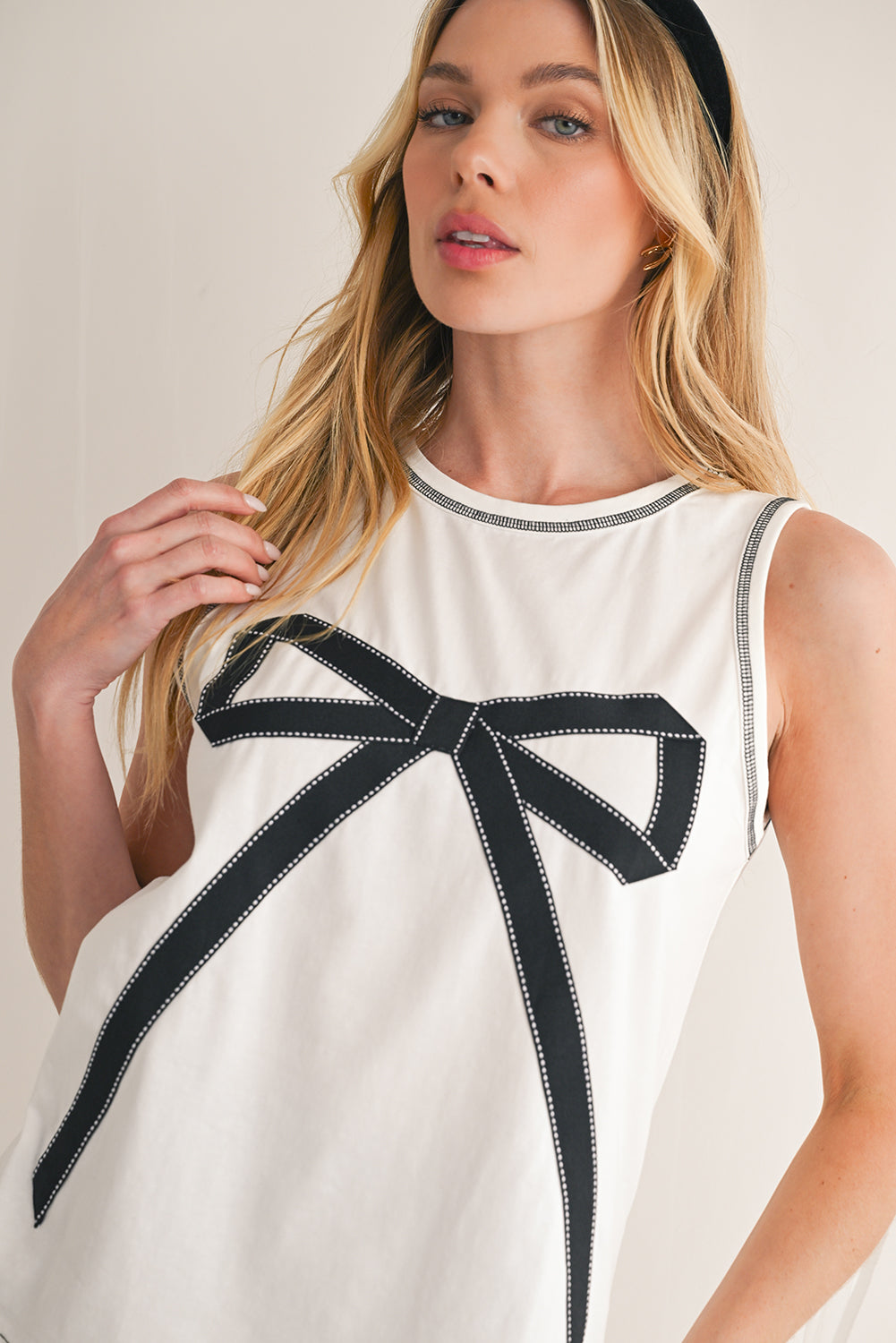 - Delicate and charming, this sleeveless top features a sweet bow stitching trim that adds a touch of elegance to your outfit.